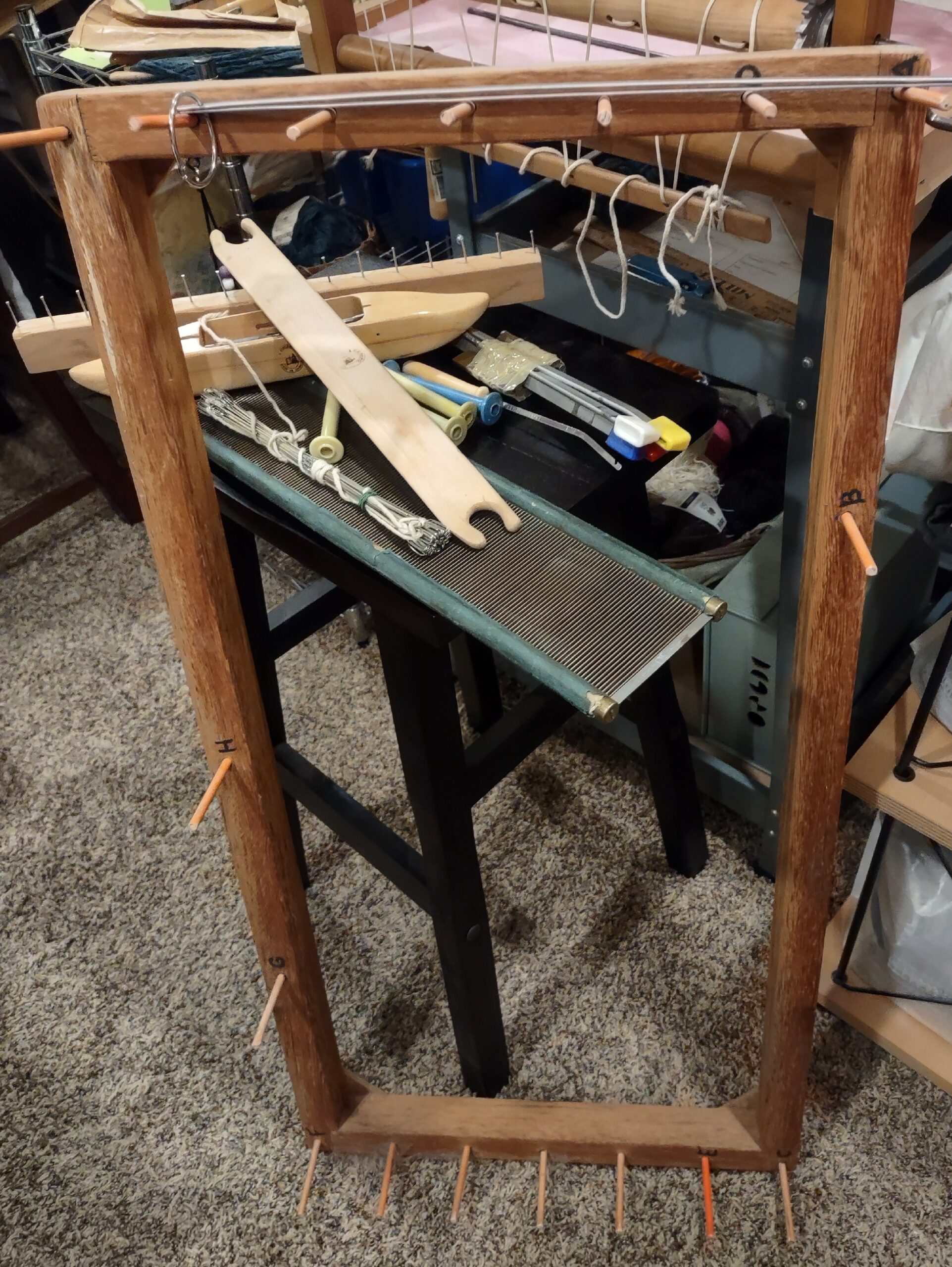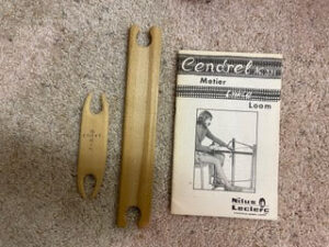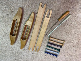 4 reeds #5 8 12 15, 2 boat shuttles, 1 reed and heddle hook, 6 bobbins, 2 wood shuttles. Made by assembling 2 table looms.   $375.00