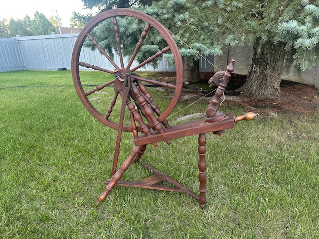 Antique spinning wheel in very good condition. Complete and in working order. It is made of dark wood, and constructed without any metal screws or bolts, about 40 inches high. The spinning wheel was a cherished part of my grandmother, Mary Weber’s antique collection. She lived in Sedgewick, Alberta.