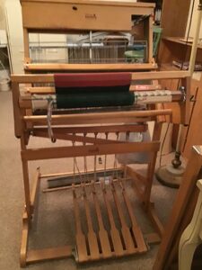 Includes warping board, 1 boat shuttle, 1 stick shuttle, 4 bobbins, extra heddles, #10 and #12 reeds, raddle, lease sticks and the original levers. $350.