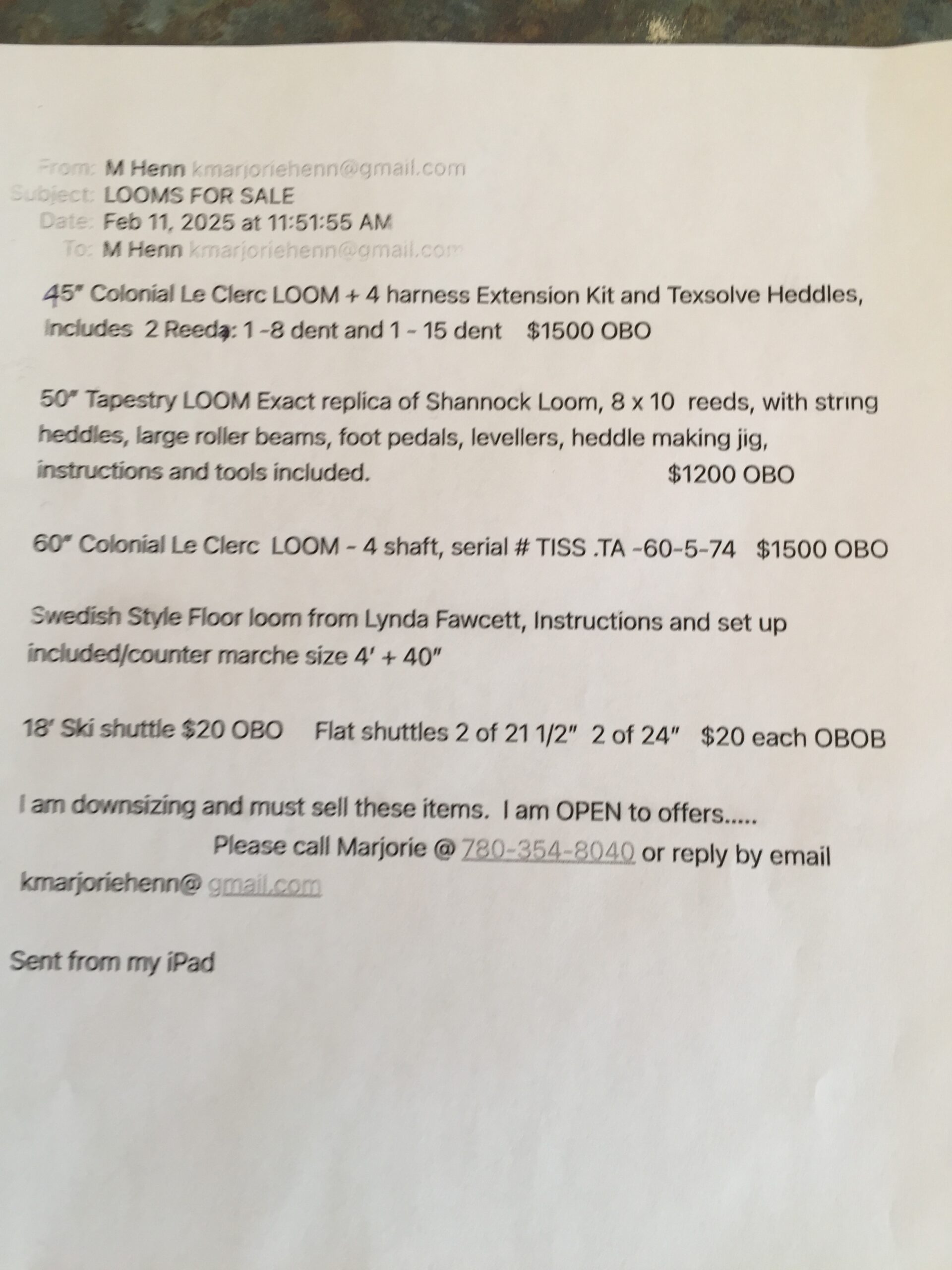 - To submit an ad, please include a description of not more than 50 words, a contact name, and phone number or email address. You may also include a photo – jpg must be less than 2MB. Send your ad to webmaster@edmontonweavers.org